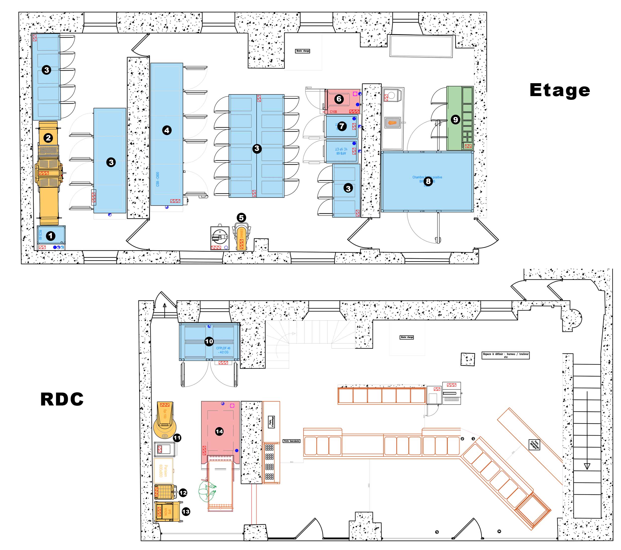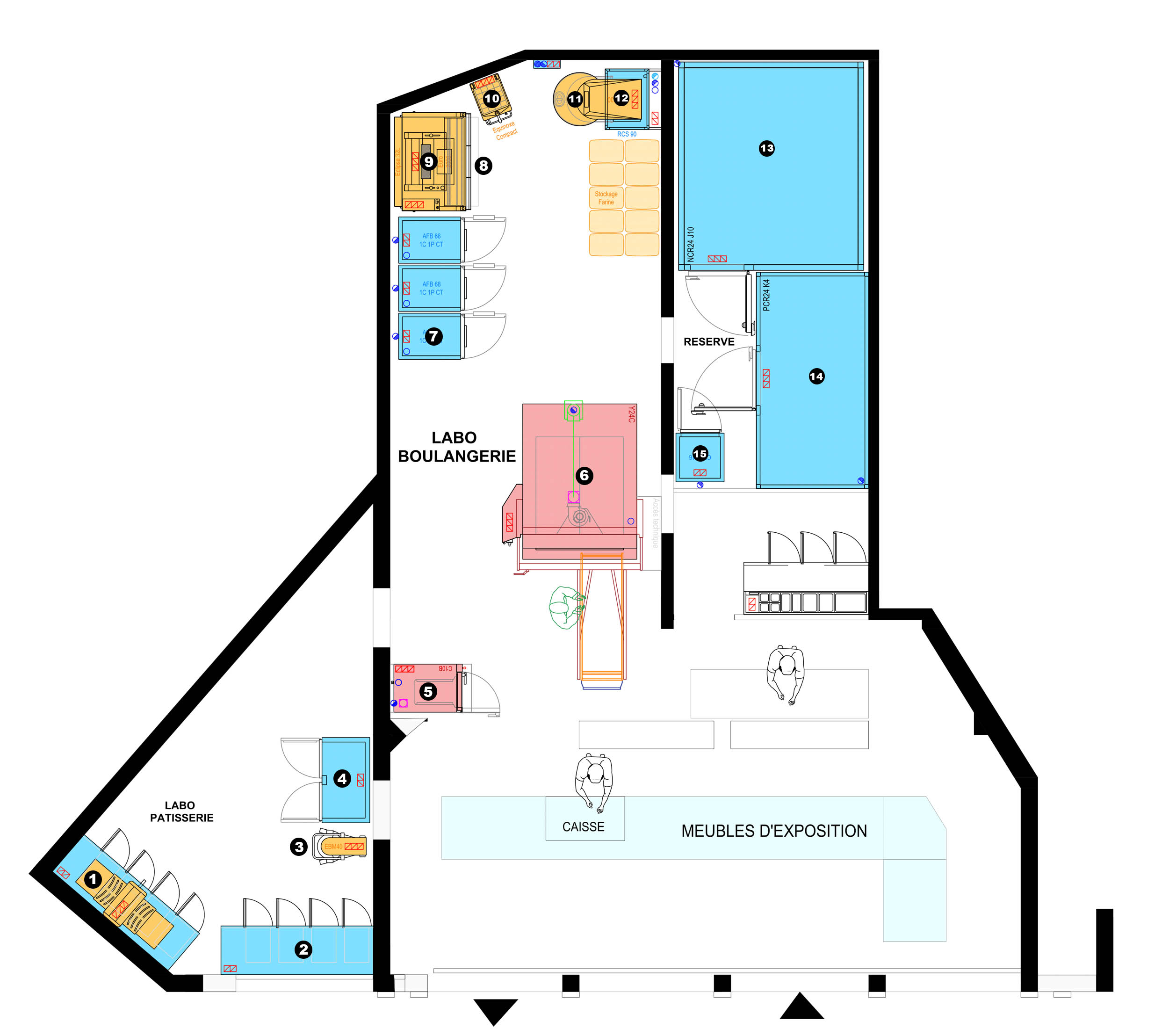 In a multi-product project, it is more clever to separate the equipment needed to open a pastry shop, and that for the snacking and bakery. Here, the snacking and bakery part are on the first floor, in order to be able to easily supply the shop window. The pastry shop is upstairs, requiring little restocking throughout the day. Large storage areas are available to allow for the production of a large number of cakes. The retarder proofing cabinet is placed in front of the electric convection oven: it is easier to put your products directly into the oven by turning around, than by having to move around the laboratory. Finally, the finished products can be put on the elevator to go directly to the store. Everything has been thought of to make your work easier!
