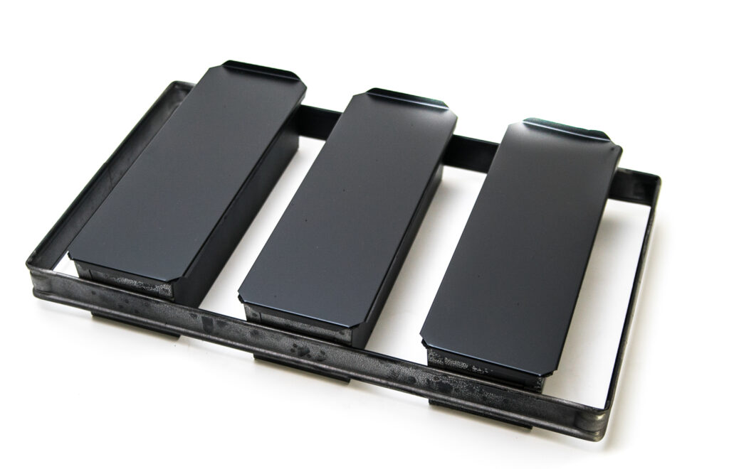 Characteristic : Materials: aluminized steel Shape: rectangular Colour: Dull grey Format: 175x124/110x77 mm Height: 70 mm Number of moulds : 3 Embossed : Yes Lid : No Weight of bread…